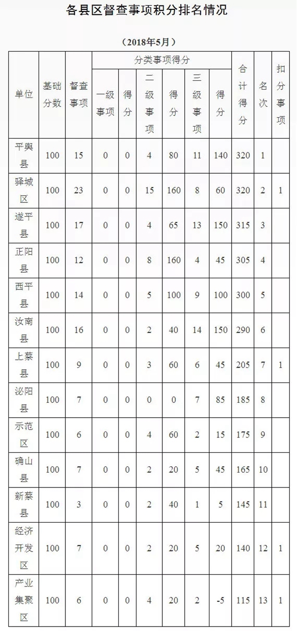 【駐馬店廣視融媒訊】2018年5月份,參與積分排名的事項共320項,其中市長安排各類重要事項154項,市長批示件督辦事項33項,人大建議政協(xié)提案已辦結(jié)事項86項,表揚批評類事項47項。參與排名的縣區(qū)和市直單位64個,經(jīng)督查“一張網(wǎng)”系統(tǒng)大數(shù)據(jù)自動排名統(tǒng)計,對縣區(qū)、市直單位全部完成督查事項分別排名前三位的平輿縣、遂平縣、正陽縣、市農(nóng)業(yè)局、市城管局、市住房管理中心進行通報表揚。