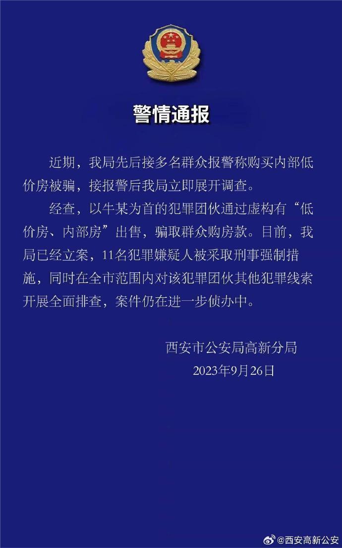 @西安高新公安 微博通報,近期,該局先后接多名群眾報警稱購買內(nèi)部低價房被騙,接報警后警方立即展開調(diào)查。經(jīng)查,以牛某為首的犯罪團(tuán)伙通過虛構(gòu)有“低價房、內(nèi)部房”出售,騙取群眾購房款。目前,警方已經(jīng)立案,11名犯罪嫌疑人被采取刑事強制措施,同時在全市范圍內(nèi)對該犯罪團(tuán)伙其他犯罪線索開展全面排查,案件仍在進(jìn)一步偵辦中。