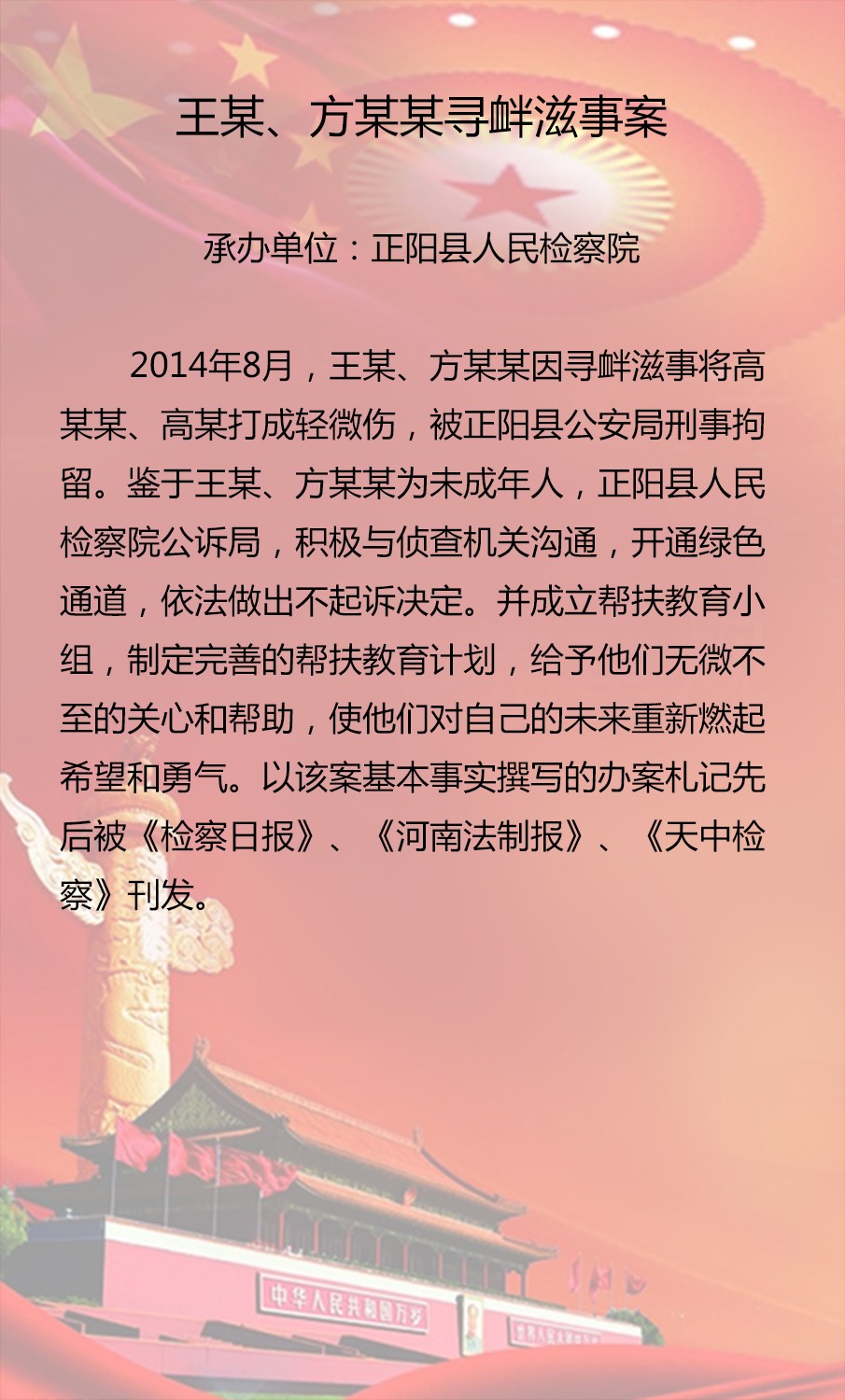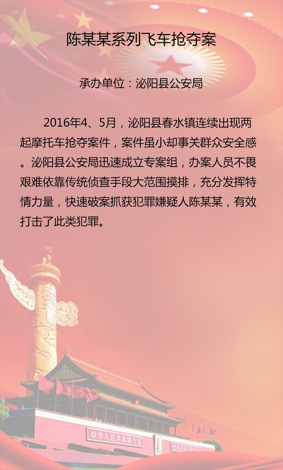 為展示我市政法機(jī)關(guān)在維護(hù)社會(huì)大局穩(wěn)定、促進(jìn)社會(huì)公平正義、保障人民安居樂業(yè)中取得的突出成效,彰顯嚴(yán)格執(zhí)法、公正司法的價(jià)值理念,激發(fā)廣大政法干警爭(zhēng)辦精品案件、爭(zhēng)當(dāng)辦案能手、爭(zhēng)創(chuàng)一流業(yè)績(jī)的創(chuàng)先爭(zhēng)優(yōu)意識(shí),市委政法委在全市政法系統(tǒng)組織開展第三屆“十大精品案件”評(píng)選活動(dòng)?,F(xiàn)將推薦上報(bào)篩選出的20起案件公示如下,歡迎大家參與投票評(píng)選。投票時(shí)間從即日起到12月20日截止。