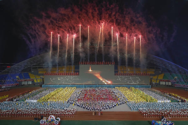 晚8時,在激越的樂曲中,武警戰(zhàn)士和旗手分別簇?fù)碇r艷的五星紅旗、省運會會旗以及本屆運動會會旗入場。在彩旗引領(lǐng)下,參加本屆運動會的省直機關(guān)代表團、學(xué)校組代表團、省直管縣市代表團依次入場,現(xiàn)場3萬多名觀眾報以熱烈的掌聲。