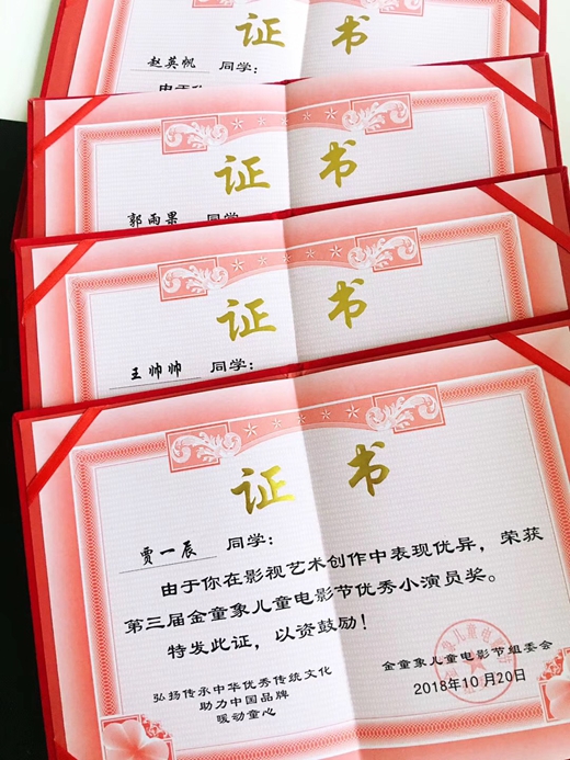 賈一辰,王子正,郭雨果,趙英帆,石昊正等同學(xué)獲得金童象電影節(jié)優(yōu)秀小演員獎