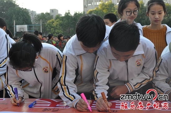宣誓結(jié)束后,同學(xué)們在莊嚴(yán)的國旗下,在“為了明天珍愛生命遠(yuǎn)離毒品”的橫幅上簽下自己的名字。