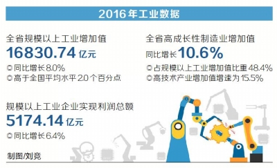 據(jù)統(tǒng)計(jì),2016年,全省規(guī)模以上工業(yè)增加值達(dá)到16830.74億元,同比增長(zhǎng)8.0%,較2015年同比回落0.6個(gè)百分點(diǎn),但仍高于全國(guó)平均水平2.0個(gè)百分點(diǎn)。規(guī)模以上工業(yè)企業(yè)實(shí)現(xiàn)利潤(rùn)總額5174.14億元,同比增長(zhǎng)6.4%,高于2015年同期6.5個(gè)百分點(diǎn)。