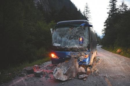巨石砸中旅游大巴 女兒被護(hù)在父母中間