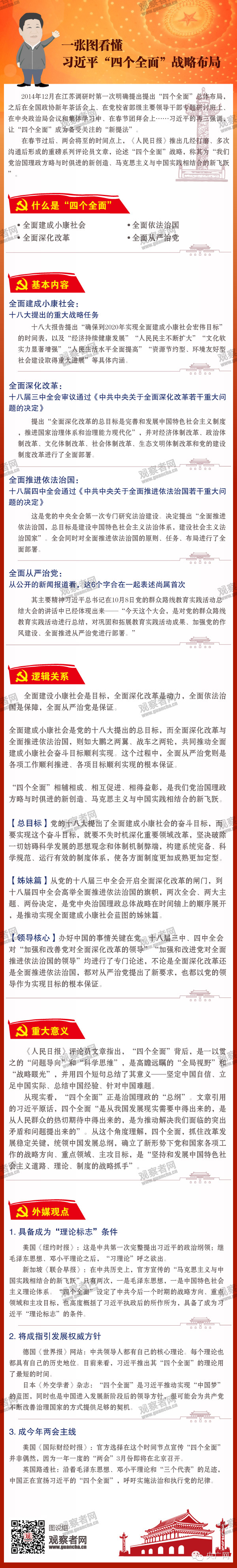 那么,習(xí)近平“四個(gè)全面”戰(zhàn)略布局到底是什么?四個(gè)全面之間有什么邏輯關(guān)系?有什么重大意義?外媒如何看待?觀察者網(wǎng)帶你一一看來。