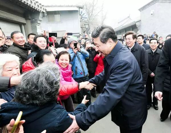 2014年2月25日,習(xí)近平在北京東城區(qū)與群眾熱情握手。 新華社 圖