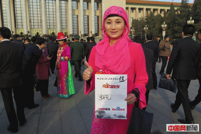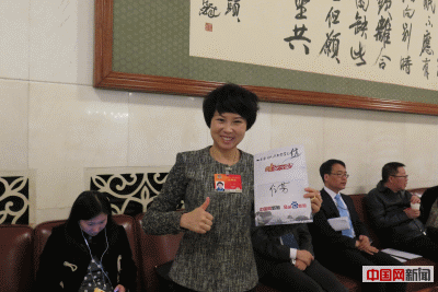 2015年3月12日,北京人民大會堂外,全國人大代表、甘肅省積石山保安族東鄉(xiāng)族撒拉族自治縣吹麻灘中學(xué)教師馬雪花點贊“四個全面”。