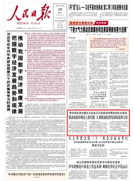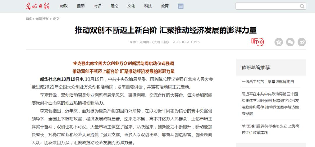《人民日報(bào)》頭版以《李克強(qiáng)出席全國大眾創(chuàng)業(yè)萬眾創(chuàng)新活動(dòng)周啟動(dòng)儀式強(qiáng)調(diào):推動(dòng)雙創(chuàng)不斷邁上新臺(tái)階 匯聚推動(dòng)經(jīng)濟(jì)發(fā)展的澎湃力量》為標(biāo)題報(bào)道。