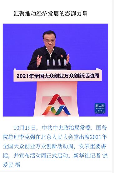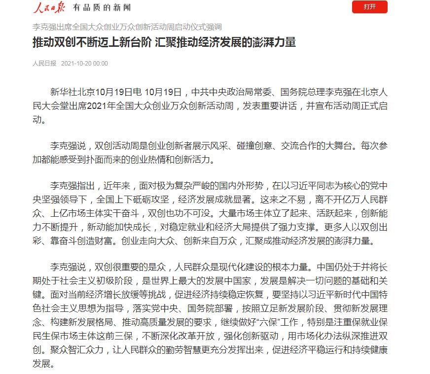 人民日報(bào)客戶端以《2021全國雙創(chuàng)周主會(huì)場活動(dòng)開幕》《李克強(qiáng)出席全國大眾創(chuàng)業(yè)萬眾創(chuàng)新活動(dòng)周啟動(dòng)儀式強(qiáng)調(diào):推動(dòng)雙創(chuàng)不斷邁上新臺(tái)階 匯聚推動(dòng)經(jīng)濟(jì)發(fā)展的澎湃力量》為標(biāo)題報(bào)道。