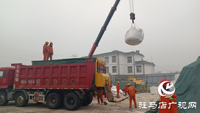 1月17日下午,在駐馬店分公司遂平工區(qū),四輛滿載融雪劑的貨車從山東濰坊緊急運抵,工作人員正有序進行卸貨。