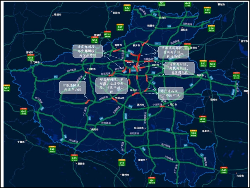 圖2. 元旦假期鄭州周邊易擁堵路段(紅色路段)預(yù)測(cè)分布圖
