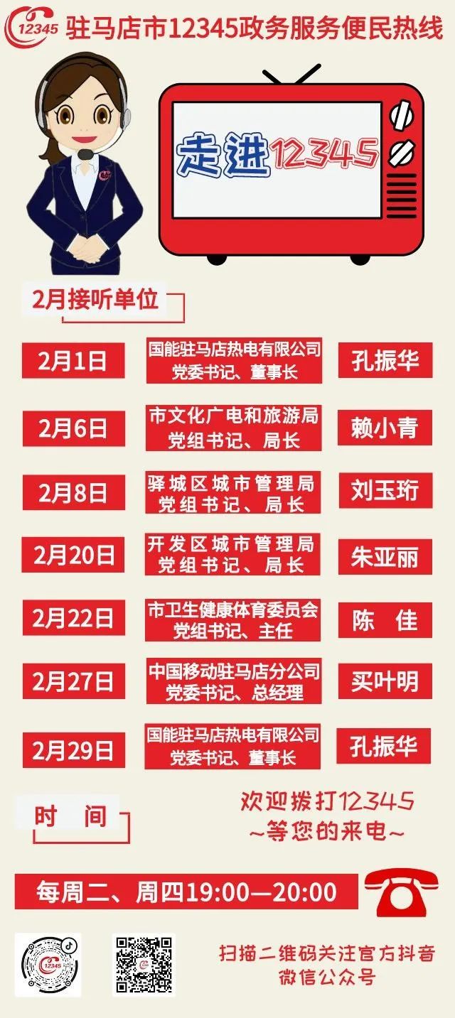 按照《駐馬店市人民政府辦公室關于建立市直單位現(xiàn)場接聽12345熱線電話制度的通知》(駐政辦明電〔2019〕103號)、《駐馬店市12345政務服務便民熱線中心關于2024年2月份市直單位、中心城區(qū)區(qū)直單位及鄉(xiāng)鎮(zhèn)(街道)現(xiàn)場接聽12345熱線電話的通知》(駐熱線文〔2024〕1號)相關要求,2月份將由以下單位參與12345熱線接聽活動,歡迎廣大市民就相關問題進行來電。