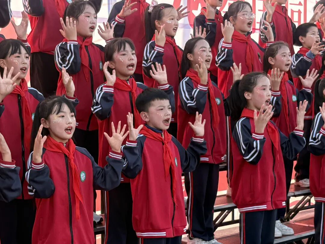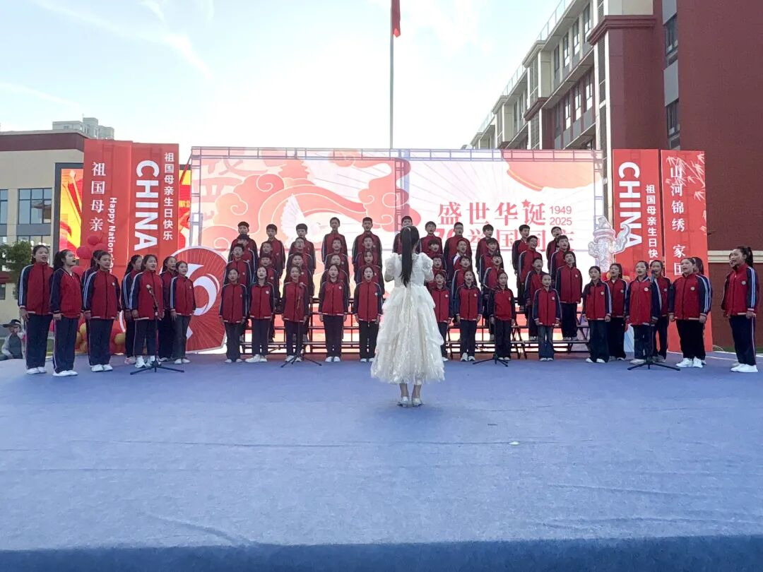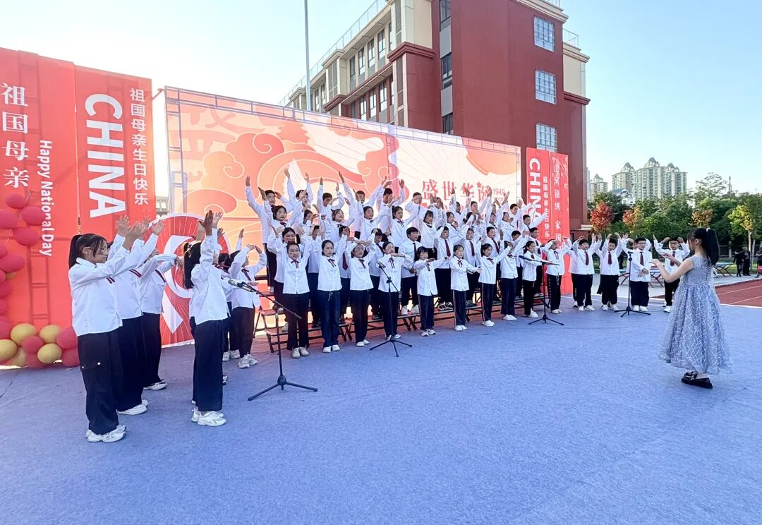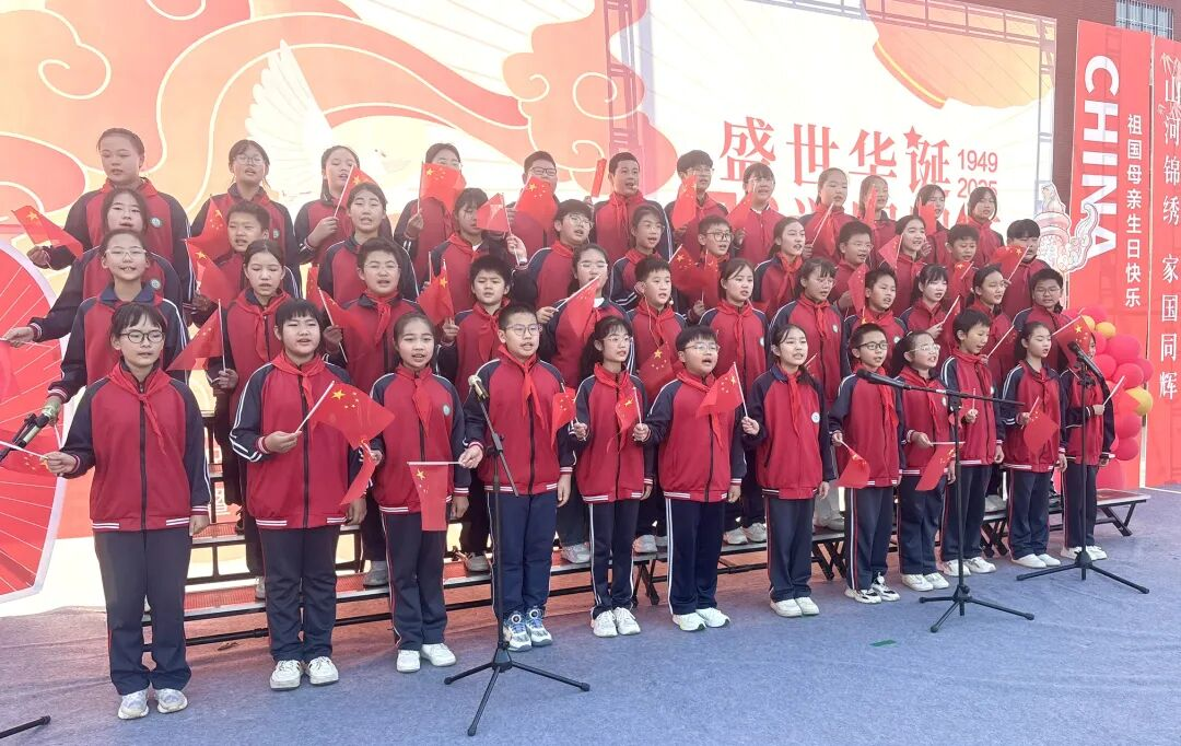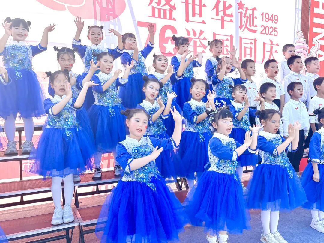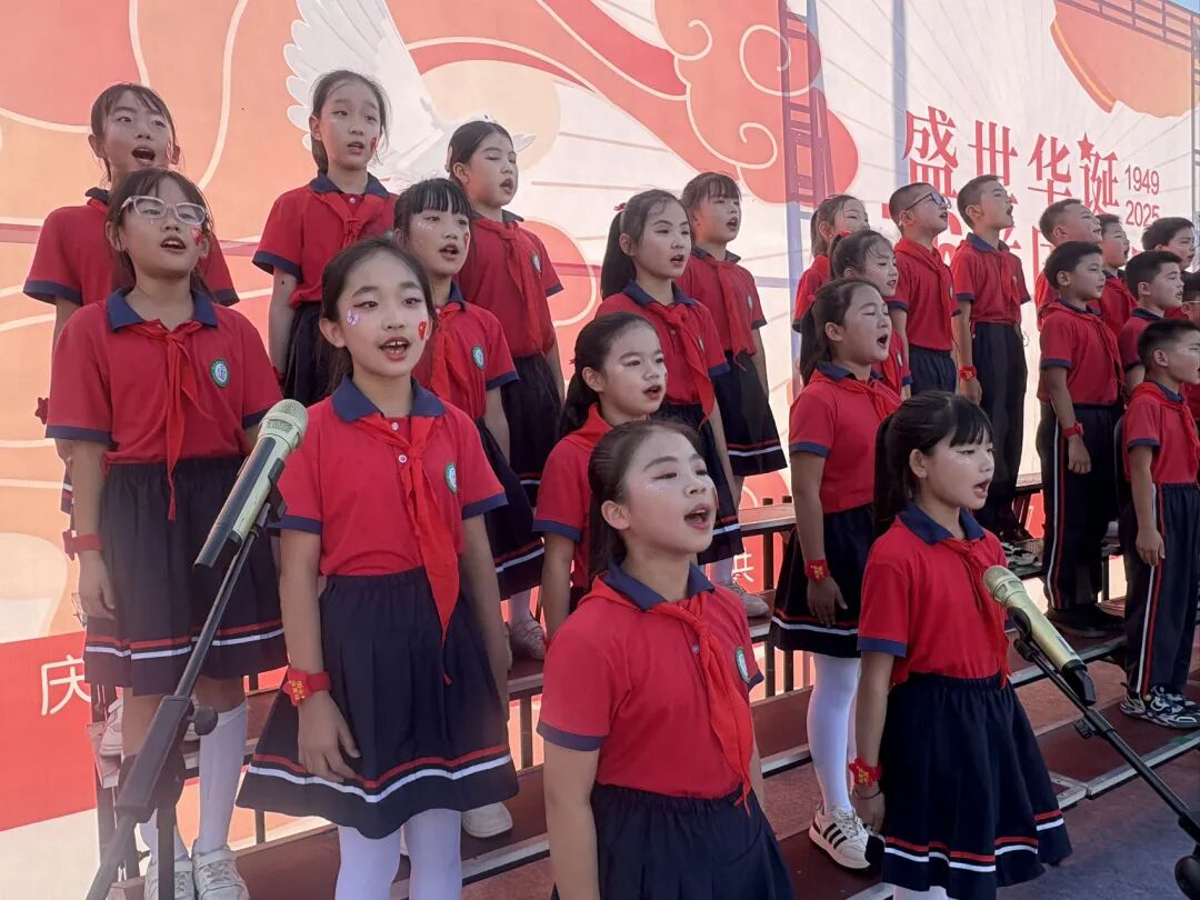 孩子們的歌聲或許稚嫩,卻充滿力量;動作或許簡單,卻飽含真誠。他們揮舞著小紅旗,臉上洋溢著自豪的笑容,將對祖國的祝福融入每一個音符、每一個眼神。臺下師生跟著旋律輕輕哼唱,掌聲與歌聲交織,匯成一片愛國的海洋。