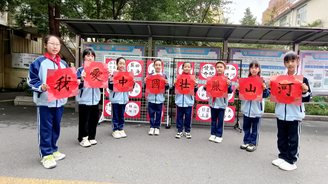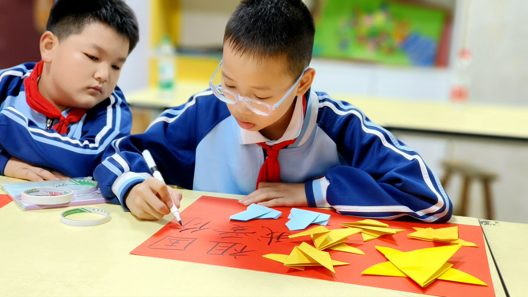 藝術創(chuàng)作展區(qū)同樣精彩紛呈。六年級學生圍繞“國慶”主題創(chuàng)作手抄報,天安門、五星紅旗、航天火箭等元素躍然紙上,色彩絢麗且滿含巧思;書法社團成員揮毫潑墨,“山河壯麗”“我愛中國”等書法作品筆力遒勁,墨香氤氳中滿是對家國的深厚情誼。折紙與創(chuàng)意畫社團則帶來“紅色記憶”主題作品展,精巧的五角星窗花、溫馨的“天安門日出”創(chuàng)意畫,將傳統(tǒng)技藝與愛國情懷完美融合,每一件作品都是孩子們對祖國最純真、最真摯的祝福。