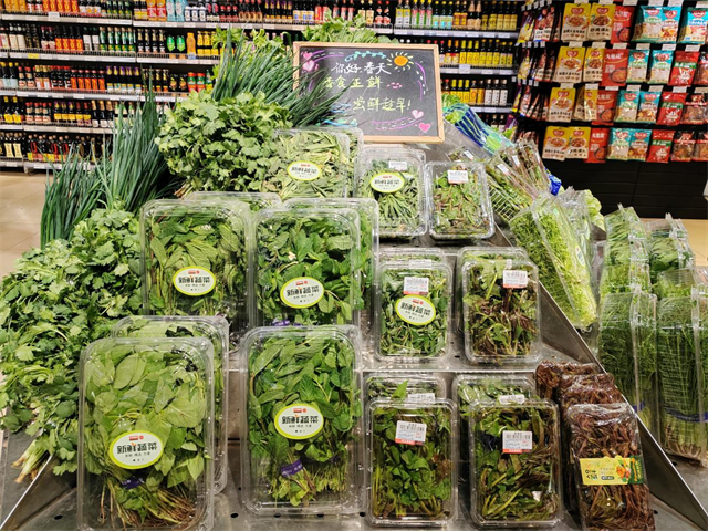 走進歡樂愛家超市迪士尼店,便能看到香椿、面條菜、芹菜、紅莧菜、春筍等鮮嫩水靈的時蔬春菜碼放整齊,十分惹眼,吸引了不少市民前來選購。