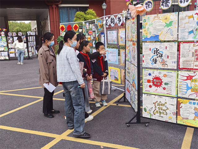 校園讀書節(jié)匯報展示活動現(xiàn)場布置得溫馨而富有創(chuàng)意,學(xué)校門口內(nèi)南、北兩側(cè)擺滿了展示架,仿佛進(jìn)入了一個五彩斑斕的知識海洋。同學(xué)們用思維導(dǎo)圖、讀書小報、書評小作家、好書配畫、閱讀記錄卡、好書推薦卡等各種各樣的圖文形式,記錄了自己在讀書節(jié)的閱讀收獲,每一幀圖文的背后,都承載著孩子們豐厚的讀書積淀。學(xué)生們通過豐富多彩的創(chuàng)作,將書籍內(nèi)容轉(zhuǎn)化為生動的視覺藝術(shù)作品,為閱讀插上了科技的翅膀。“我喜歡讀書,因?yàn)闀锊刂枚嗌衿娴氖澜?!書本就像一臺魔法機(jī)器,帶我“走”遍了長城、金字塔、南極北極,甚至外太空!老師說“讀萬卷書,行萬里路”,我希望大家都能找到自己喜歡的書,因?yàn)槊勘緯际且簧乳T,打開它,你會發(fā)現(xiàn)一個全新的世界!”學(xué)生王梓臣說。