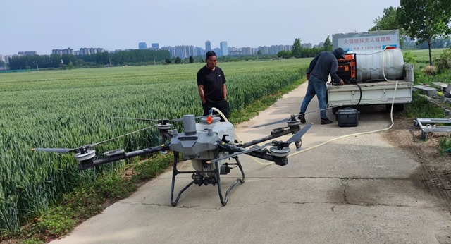 他們耐心細致地向群眾講解小麥病蟲發(fā)生規(guī)律、危害及防治技術(shù)要點,并深入田間地頭開展病蟲害監(jiān)測,指導(dǎo)群眾科學(xué)安全使用農(nóng)藥、追肥澆水、雜草清除等工作。同時,技術(shù)員熟練地進行配藥灌水,準確操作無人機,在麥田低空飛行,均勻地噴灑著殺蟲劑、殺菌劑等混配液,有效提升了防治效果。