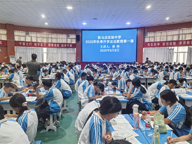 為增強(qiáng)學(xué)生法治意識,筑牢校園安全防線,2025年9月8日下午,駐馬店實驗中學(xué)在綜合樓五樓舉行了以“法治護(hù)航,健康成長”為主題的秋季開學(xué)法治教育第一課專題講座。駐馬店市司法局副局長、學(xué)校法治副校長蔣錚同志擔(dān)任主講,駐馬店市實驗中學(xué)金山校區(qū)副校長趙青松主持,七年級師生齊聚一堂,共同接受了這場深刻的法治洗禮。