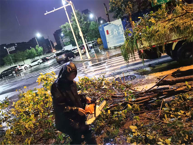 發(fā)現(xiàn)緊急情況后,開發(fā)區(qū)城管事務(wù)中心工作人員立即趕赴現(xiàn)場,對現(xiàn)場進(jìn)行封閉管理,同時(shí)安排作業(yè)人員使用電鋸等設(shè)備對倒伏樹木進(jìn)行分段切割,并將枝干、落葉等迅速清運(yùn),清掃路面,恢復(fù)交通。整個(gè)處置過程反應(yīng)迅速、分工明確、操作專業(yè),有效化解了夜間安全隱患,保障了校園周邊環(huán)境的順暢與安全。