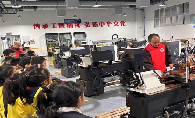 車床展示區(qū)則成為互動焦點,老師現(xiàn)場操作設(shè)備進行演示,結(jié)合操作過程向?qū)W生提問,圍繞車床工作原理、傳統(tǒng)與自動化加工差異等內(nèi)容展開互動。同學(xué)們積極舉手、踴躍作答,現(xiàn)場思維活躍,熱烈的互動不僅讓學(xué)生快速掌握相關(guān)知識,更點燃了探索機械制造的興趣。