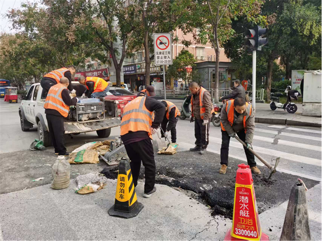 施工期間,工作人員錯時錯峰作業(yè),運用小型切縫機、電鎬、平板夯等設(shè)備,用瀝青冷補料應(yīng)急維修路面“小坑微塘”,保障道路完好平整,守護群眾“腳下安全”。截止目前,已維修破損瀝青路面11處。